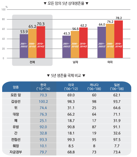 2010³â - 2014³â ¾Ï¹ß»ýÀÚÀÇ 5³â »ó´ë»ýÁ¸À²ÀÌ Á¡Á¡ ³ô¾ÆÁ®¼ 70%¸¦ ³Ñ¾î 3¸í Áß 2¸í ÀÌ»óÀº 5³â ÀÌ»ó »ýÁ¸ÇÒ °ÍÀ¸·Î ÃßÁ¤µÇ¾ú´Ù.