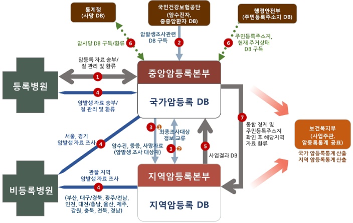 - 보건복지부에서 지정받은 해당지역암등록본부에서 해당 지역의 암발생 및 생존율 등 암에 관한 자료의 수집•분석•관리 수행