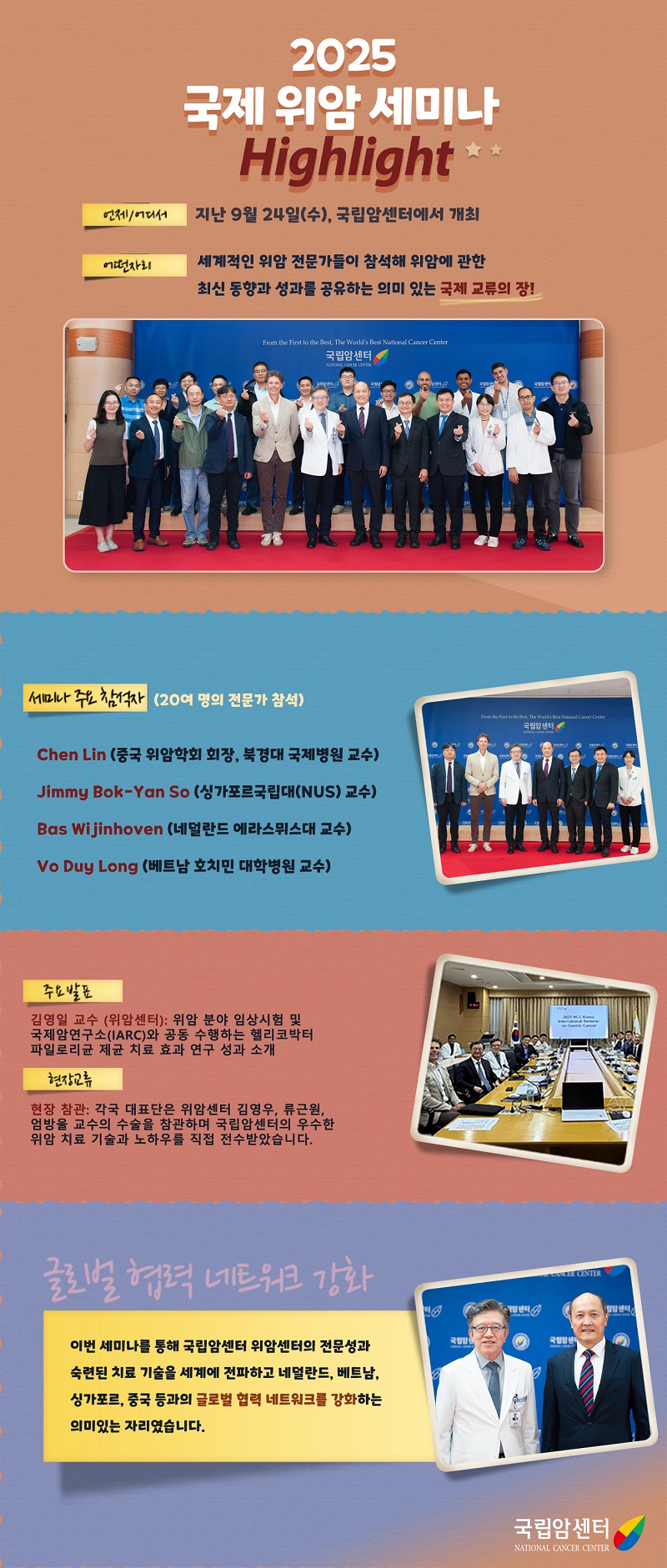 국립암센터는 최근 세계보건기구(WHO)로부터 ‘세계보건기구 암 관리 및 예방 협력센터(WHO Collaborating Center for Cancer Control and Prevention)’로 재지정되었다. 지정기간은 향후 4년으로, 2029년 7월까지이다. WHO 협력센터는 WHO가 분야별 전문기관을 선정해 조직한 국제 협력 네트워크로, 국립암센터는 지난 2005년‘암 등록, 예방 및 조기검진을 위한 협력센터’로 최초 지정된 이래로 올해까지 20년간 암 등록, 관리 및 예방 분야에서 세계보건기구와 긴밀한 협력을 이어나가고 있다.