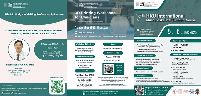 세계적인 학술 무대에서 국립암센터의 임상 역량을 공유하는 일은 개인의 성과 및 기관의 위상을 보여주는 중요한 순간이다. 육종암센터 정형외과 강현귀 교수는 3D 프린팅 기반 골재건 수술과 근골격종양학 분야의 임상·연구 성과를 바탕으로 홍콩대학교 의과대학 정형외과·외상학부의 명예로운 방문교수로 초빙되었다. 이번 글은 그 일주일간의 학술 교류와 현장에서 느낀 소회를 담은 기록이다.