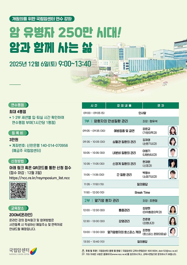 암 진단, 치료 기술 향상에 따라 암 생존율은 높아지고 있으나, 암은 여전히 우리나라 사망원인 1위인 질병이다. 암 유병자 250만 명인 시대에 암 유병자 증가에 따라 치료뿐만 아니라 암환자의 삶의 질 향상을 위한 ‘치료 후 관리’가 더욱 중요해지고 있다. 이에 지역사회에서 암환자를 돌보는 개원의의 역할이 점차 확대되고 개원의를 위한 연수강좌의 필요성이 증가하고 있다. 국립암센터는 암 환자 관리의 질적 향상을 위해 개원의를 위한 연수강좌를 마련해 개원의에게 실질적인 도움이 되는 심층적인 교육을 제공했다.