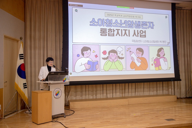 또한, 이날 워크숍에 참석한 교사들에게는 국립암센터 암생존자통합지지실 소아청소년팀에서 개발한 소아청소년암생존자 학교 복귀 관련 책자를 배포하여, 현장에서 학생들을 지도할 때 활용할 수 있는 실질적인 교육 자료를 제공했다. 이와 함께 소아청소년암생존자 통합지지 사업을 소개하는 브로슈어도 함께 배포하여, 학교에서 필요한 경우 국립암센터와 추후 연계할 수 있도록 지원했다. 국립암센터 암생존자통합지지실 소아청소년팀을 이끌고 있는 소아청소년암센터 박현진 교수는 “최근 소아청소년암의 5년 생존율은 85%정도로 치료 종결 후 생존자들이 사회 구성원으로 원활히 복귀할 수 있도록 돕는 것이 중요한 과제”라며, “성공적인 학교복귀는 단순히 학업지원을 넘어 취업·결혼 등 사회적 문제와도 연결되어 있어, 이번 워크숍이 교사들의 이해를 높이고 생존자들의 학교생활 적응을 도울 수 있는 계기가 되길 바란다”고 전했다.