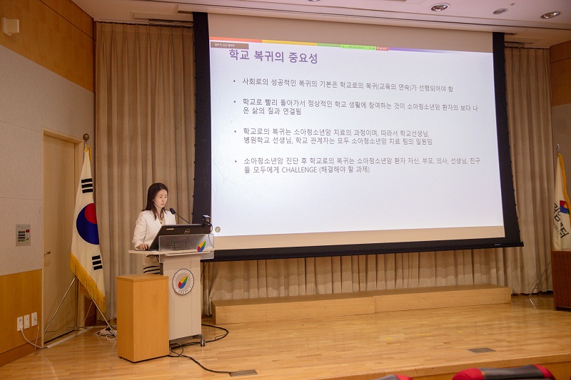 워크숍의 주요 프로그램은 ▲소아청소년암생존자 통합지지 사업 소개 및 소아청소년암의 이해 ▲소아청소년암생존자의 성공적인 학교복귀 ▲국립암센터 병원학교 운영의 실제 ▲소아청소년암 학생의 이해와 교사의 정서적 지원 등으로 구성됐다.
