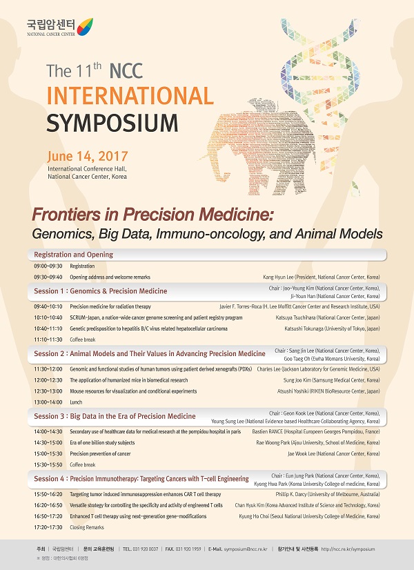 안녕하십니까? 국립암센터는 암 분야의 주요 현안에 대한 국내외 석학의 심층적인 토론을 통하여 우리나라 암 연구, 진료, 교육 및 국가암관리 수준을 향상시킬 수 있는 방안을 탐색하기 위해 2007년부터 국제심포지엄을 개최하고 있습니다. 올해는 "Frontiers in Precision Medicine: Genomics, Big Data, Immuno-oncology and Animal Models" 주제로 국내외 정밀의료의 최신 연구동향에 대해 논의하고 교유하는 장을 마련하고자 합니다. 관심있는 분들의 많은 참여 부탁드립니다.
