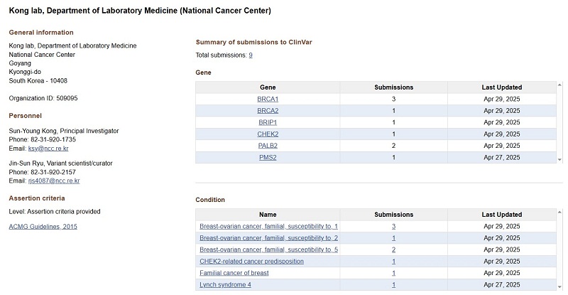 국립암센터국제암대학원대학교 보건AI학과 석사과정 장준하 대학원생(지도교수 김현진·공선영)이 소속 연구팀의 유전체 분석 연구를 바탕으로, 미국 국립생물정보센터(NCBI)가 운영하는 유전변이 데이터베이스 ‘클린바(ClinVar, https://www.ncbi.nlm.nih.gov/clinvar/)’에 총 10건의 유전변이를 제출해 모두 등재 승인을 받았다.